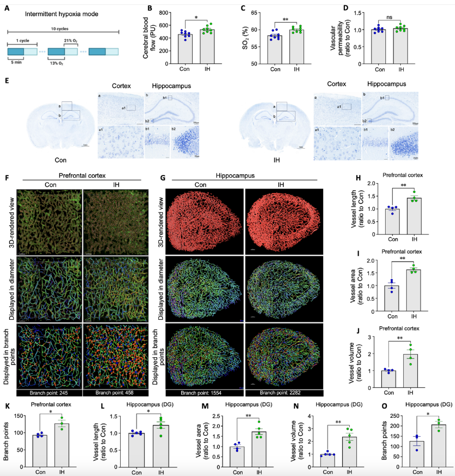 前额叶皮质和海马是重要的认知相关脑区,因此,实验进一步评估了间歇性低氧处理后的脑微循环。通过注射Lectin标记血管内皮并进行形态学分析(图1F和G),发现间歇性低氧组小鼠在前额叶皮质和海马的血管密度和分支点数量显著增加。通过对脑组织切片的定量分析,血管长度、面积、体积及分支点数量在间歇性低氧组小鼠中明显增加(图1H–O)。这些结果表明,间歇性低氧通过促进血管生成增强了小鼠脑部的血流供应,从而改善了微循环。