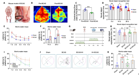 为研究间歇性低氧对血管性认知障碍与痴呆模型小鼠的认知保护作用,吉训明等采用双侧颈总动脉狭窄手术建立血管性认知障碍与痴呆模型(图2A)。双侧颈总动脉狭窄小鼠术后脑血流显著降低,且新物体识别测试和水迷宫测试显示认知功能严重受损(图2B–F)。研究发现,间歇性低氧的预适应(间歇性低氧 + 血管性认知障碍与痴呆组)和期适应(血管性认知障碍与痴呆 + 间歇性低氧组)均能显著改善小鼠的认知功能,尤其是期适应组(图2G–K)。这些结果表明,术后间歇性低氧比术前预处理更有效地减轻了认知损伤。