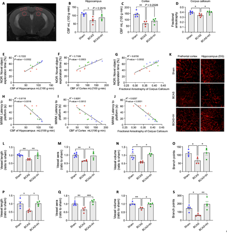 在双侧颈总动脉狭窄手术后,间歇性低氧期适应显著改善了小鼠前额叶皮质和海马的脑血流,并减轻了胼胝体纤维损伤(图3A–D)。对小鼠认知功能与皮质、海马血流灌注以及胼胝体白质完整性之间进行了线性回归分析表明,小鼠认知功能的提高与海马、皮质的血流量以及胼胝体的白质完整性呈正相关(图3E–J)。此外,通过三维重建微血管图像分析,发现前额叶皮质和海马齿状回区的血管长度、面积、体积和分支点数量在血管性认知障碍与痴呆 + 间歇性低氧组小鼠中均明显增加(图3K–S),进一步验证了间歇性低氧在改善微循环方面的作用。