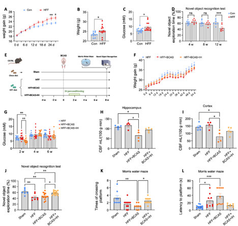 为更好地模拟临床情形,吉训明等结合了双侧颈总动脉狭窄手术与高脂高果糖(High-fat, high-fructose, HFF)饮食,建立了具有常见代谢风险因素(如肥胖和糖尿病)的血管性认知障碍与痴呆小鼠模型。虽然高脂高果糖饮食导致小鼠体重增加和血糖升高(图4A–C),间歇性低氧后处理仍能改善小鼠的脑血流并减轻由高脂高果糖饮食和双侧颈总动脉狭窄引发的认知缺损(图4H–L)。尽管高脂高果糖饮食对代谢参数的影响未完全逆转,间歇性低氧有效改善了因这些因素引起的认知功能障碍。