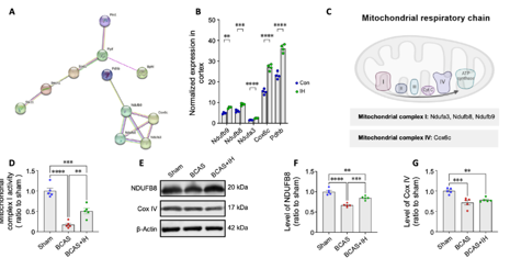 为揭示间歇性低氧的分子机制,吉训明等通过蛋白质组学分析发现,间歇性低氧显著上调了与血管生成、细胞增殖和线粒体功能相关的多种蛋白质表达,特别是线粒体复合体I相关蛋白NDUFB8和Cox IV的表达(图5A–F及图6A–G)。进一步的功能分析显示,间歇性低氧提高了线粒体复合体I的活性(图6D),并改善了小鼠脑皮质中的Ndufb8表达(图6E–G)。这些结果表明,间歇性低氧通过增强线粒体代谢能力,促进了更持久的神经保护反应,从而帮助保护了血管性认知障碍与痴呆小鼠的认知功能。