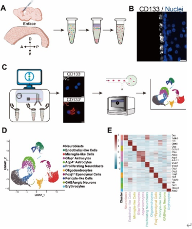 关键词: 单细胞RNA测序, 异质性, 神经源性, 室管膜细胞, 神经干细胞, 侧脑室, 免疫细胞化学分析, 神经修复, 内皮样细胞, 周细胞样细胞