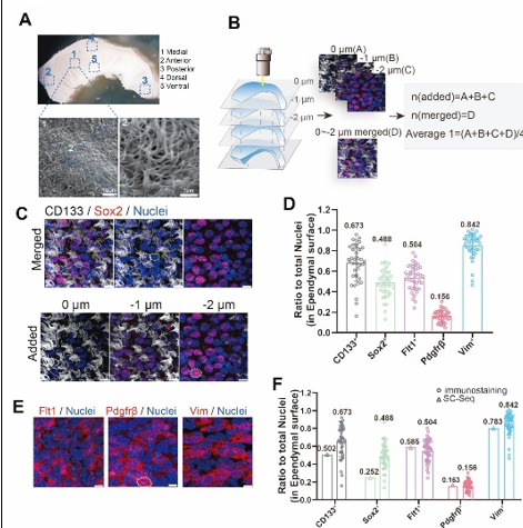 哺乳动物前脑室管膜是否含有成年神经干细胞已经争论了20余年。此次实验采用单细胞RNA测序来分析成年小鼠前脑室管膜表面细胞组成,即侧脑室侧壁部分,发现了属于室管膜表面的12种不同细胞亚型。进一步对室管膜表面进行了免疫细胞化学分析,结果显示,CD133阳性多纤毛细胞占室管膜细胞的67.63%,而其余32.37%为CD133阴性细胞。CD133阳性室管膜细胞又可分为FOXJ1+/SOX2+/ACTA2+细胞、FLT1+/CD31+/CLDN5+内皮样细胞、PDGFRB+/VTN+/NG2+周细胞样细胞、内皮-周细胞样细胞和Foxj1+内皮样细胞。CD133阴性室管膜细胞也可进一步分为内皮样细胞、Foxj1+室管膜细胞、Foxj1+内皮样细胞、周细胞样细胞、内皮-周细胞样细胞、VIM+细胞和以上标志物均阴性的细胞。上述结果提示,此次全面分析证实了成年小鼠前脑室管膜表面的异质性,且既往有关成体室管膜细胞是否存在神经干细胞的不同观点是由于不同研究者关注了不同的室管膜细胞群所致。这项研究为临床内源性神经干细胞的探索提供了新的视角,为神经系统疾病的干细胞治疗铺平了道路。