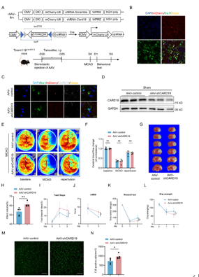 课题组通过在Tmem119CreERT2小鼠立体定位注射AAV构建了小胶质细胞CARD19条件性敲减小鼠,并制备了MCAO模型模拟缺血性卒中。与对照小鼠相比,小胶质细胞CARD19条件性敲减小鼠的神经功能缺损加重,脑梗死体积增大,死亡的神经元数量增加,神经炎症加重,小胶质细胞激活程度更显著(图2)。这表明,小胶质细胞CARD19能够减轻卒中后急性期神经炎症,改善缺血性脑损伤。