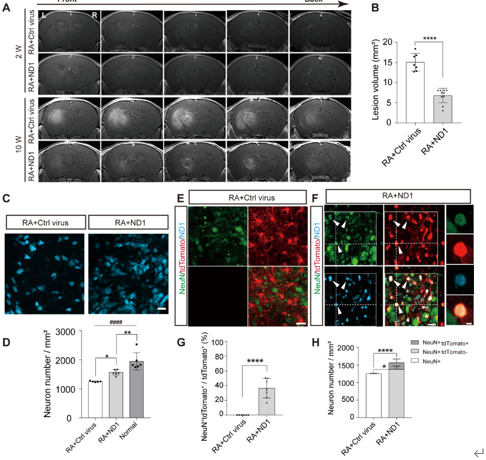 核磁共振结果显示,放射性脑损伤小鼠在造模后10周时观察到明显的损伤灶,且使用ND1治疗后的小鼠损伤灶体积明显小于对照病毒组小鼠,证明ND1在表达后发挥治疗作用(图1A和B)。ND1的治疗不仅减小损伤灶的体积,还减少神经元的丢失(图1C和D)。在造模后10周时,ND1治疗组小鼠激活的星形胶质细胞约有36%转分化为神经元,体现为这些细胞既表达tdTomato信号,又表达NeuN信号;而对照组小鼠tdTomato阳性的细胞未发现与NeuN信号共标(图1E-G)。此外,ND1治疗组小鼠非tdTomato阳性的神经元密度高于对照病毒组小鼠,说明ND1的过表达还发挥对本底神经元的保护作用(图1 H)。