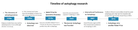 自噬是细胞通过溶酶体降解细胞内损伤或过剩的生物分子,以维持细胞稳态的生理过程。自噬的研究经历了多个阶段:1955年,比利时生物化学家Christian de Duve发现了溶酶体并创造了“自噬”一词,用来描述细胞降解和回收其成分的过程,特别是在对压力或营养剥夺的反应中;1974年,研究人员使用电子显微镜观察了细胞中的自噬空泡,这些空泡被鉴定为参与细胞质组分降解的双膜结构。在20世纪70-80年代,认为自噬可以作为细胞在营养剥夺条件下生存的一种方式的观点开始出现。研究人员还假设,自噬可能参与细胞内稳态,维持细胞中的细胞器和蛋白质的平衡。2000-2005年期间,研究开始关注自噬在各种疾病中的作用,在神经退行性疾病中,研究表明帕金森病、阿尔茨海默病和亨廷顿病等疾病与自噬途径的缺陷有关。2005年,丹尼尔·克里恩斯基创办了第一本自噬杂志《Autophagy》,并发表了一系列关于自噬机制的研究论文。2016年,小津吉森因其在自噬分子机制方面的开创性工作而获得诺贝尔生理学或医学奖(图1)。