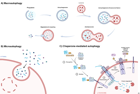 图2 三种自噬:(A)巨自噬(B)微自噬(C)分子伴侣介导的自噬
