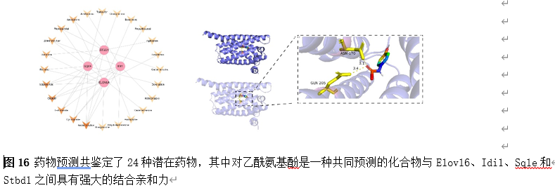 为了筛选可能调控Elovl6、Idi1、Sqle和Stbd1的小分子药物,以支持这些基因在SCI中的表观遗传调控潜力,我们通过药物预测共鉴定了24种潜在药物,其中对乙酰氨基酚是一种共同预测的化合物(图16)。因此,为了确定预测药物与关键基因之间的结合能力,对预测药物和关键基因进行了分子对接。对乙酰氨基酚被选为重点药物。对乙酰氨基酚与Elovl6、Idi1、Sqle和Stbd1结合的自由能分别为-6.3 kcal/mol、-6.1 kcal/mol、-6.1 kcal/mol和-5.4 kcal/mol(≤-5 kcal/mol 的结合能阈值表明具有强大的结合亲和力)。结果表明,对乙酰氨基酚与Elovl6、Idi1、Sqle和Stbd1之间具有强大的结合亲和力。其中,Elovl6和对乙酰氨基酚表现出最高的结合自由能,因此值得选择进行论证。