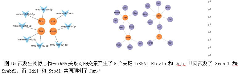 为了进一步了解生物标志物的调控因素,构建了分子调控网络。来自miRanda和miRDB数据库的预测生物标志物-miRNA关系对的交集产生了8个关键miRNA,例如mmu-miR-201-5p(图15)。此外,发现Elovl6、Idi1、Sqle和Stbd1分别预测5、3、6和7个TFs(图15)。值得注意的是,Elovl6 和 Sqle 共同预测了 Srebf1 和 Srebf2,而 Idi1 和 Stbd1 共同预测了Jun。
