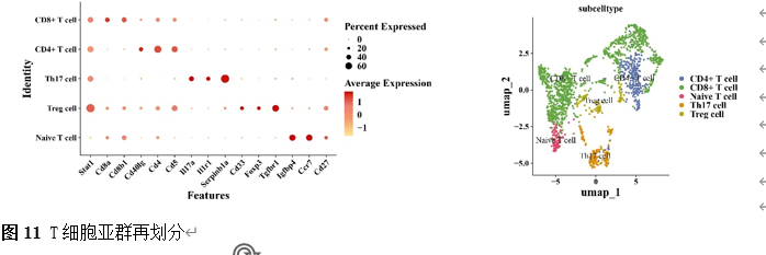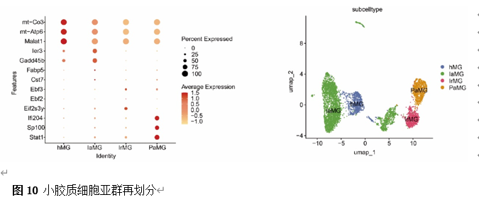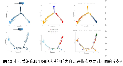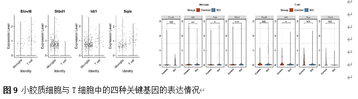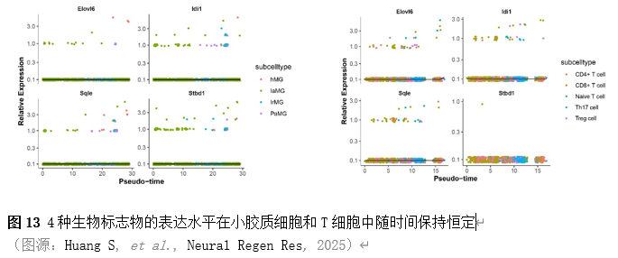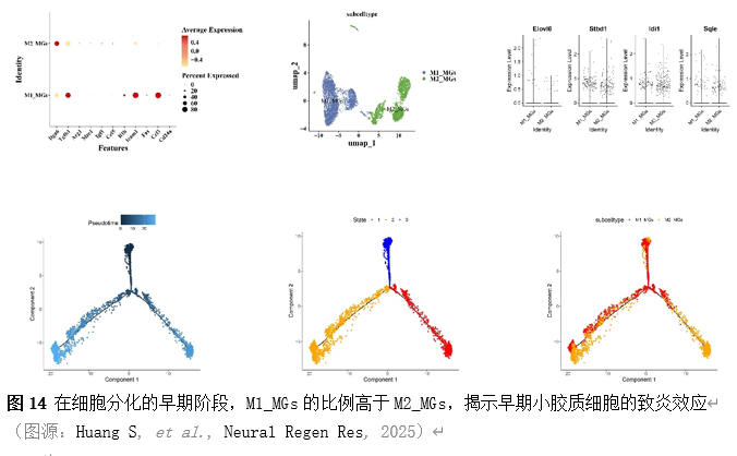 确定差异基因表达的细胞和微环境能够有效推进SCI的诊治研究。因此,该研究团队对公共数据库单细胞测序数据集GSE182803进行一系列分析。通过使用气泡图和热图,可视化每种细胞类型的重要标记基因的表达(图8)。值得注意的是,与对照组相比,SCI组表现出更高的中性粒细胞、单核细胞、成纤维细胞、T细胞和DC百分比,而小胶质细胞和B细胞的百分比较低(图8)。其中,SCI组表现出小胶质细胞的存在显着减少和T细胞的存在显着增加,从而将这两种细胞类型确立为差异细胞(图8)。进一步分析表明,Elovl6在小胶质细胞和T细胞中均均匀表达,而Idi1、Sqle和Stbd1主要在小胶质细胞中表达(图9)。SCI组和对照组小胶质细胞中Idi1、Sqle和Stbd1的表达存在差异。此外,Idi1 在这些组的 T 细胞中表现出差异表达。因此,小胶质细胞和T细胞被确定为关键细胞(图9)。作者进一步将小胶质细胞分为6个亚群,并指定为4种不同的细胞亚型:稳态小胶质细胞(hMG)、干扰素反应性小胶质细胞(IrMG)、损伤相关小胶质细胞(IaMG)和增殖相关小胶质细胞(PaMG)(图10)。同样,T细胞被分为7个亚群,并分为5种细胞亚型:CD4+T细胞、CD8+T细胞、幼稚T细胞、Th17细胞和调节性T(Treg)细胞(图11)。此外,小胶质细胞和T细胞从其初始发育阶段依次发展到不同的分支 (图12)。此外,发现4种生物标志物(Elovl6、Idi1、Sqle和Stbd1)的表达水平在小胶质细胞和T细胞中随时间保持恒定(图13)。为了了解数据集中每个细胞在细胞状态转换过程中所经历的基因表达变化,对小胶质细胞进行了降维和聚类分析。他们被重新聚集到不同的亚组中。结果表明,小胶质细胞分为6个亚组,并注释为2个细胞亚型:M1_MGs和M2_MGs(图14)。接下来,为了了解scRNA-seq数据集中每个细胞在细胞状态转换过程中所经历的关键基因表达变化,对这些关键细胞簇进行了细胞假时间轨迹分析。结果表明,小胶质细胞从发育起始位置依次发育为不同的分支,具有3个不同的发育阶段。在同一发育阶段存在多个细胞簇(图14)。在细胞分化的早期阶段,M1_MGs的比例高于M2_MGs,揭示早期小胶质细胞的致炎效应(图14)。