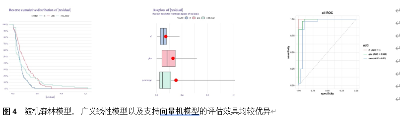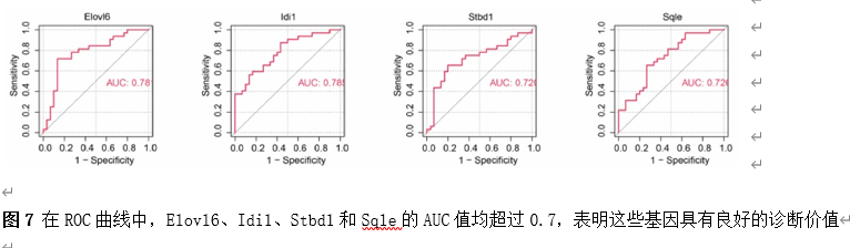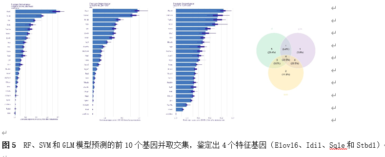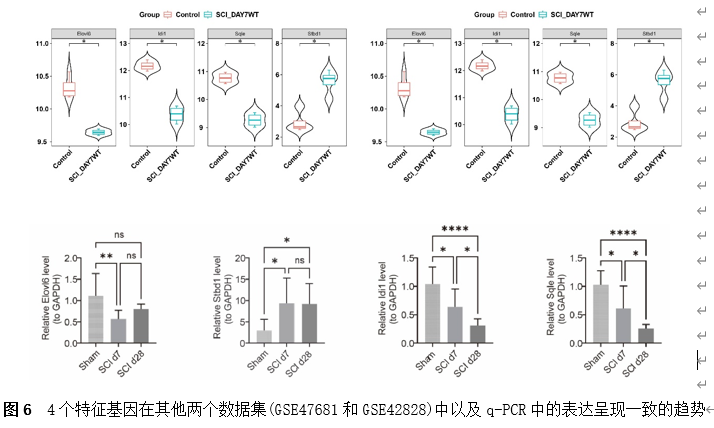 筛选差异基因是脊髓损伤靶向诊疗的关键。因此,该研究首先使用Gene Expression Omnibus(GEO)数据库中的GSE18179数据集筛选脊髓损伤前后的差异基因,并对其进行Gene Ontology(GO)和Kyoto Encyclopedia of Genes and Genomes(KEGG)分析。总共筛选出185个差异基因,并且这些基因主要调控神经元的死亡、炎症反应以及免疫反应等(图1)。此外,单样本基因集富集分析 (ssGSEA)提示,SCI后RNA修饰相关基因(RRGs)评分明显较低(图2)。随后,作者应用加权基因共表达网络分析 (WGCNA)的方法筛选出573个关键模块基因。与185个差异基因进行交叉分析,鉴定出23个候选基因(图3)。为了更高效准确地筛选出SCI后RNA修饰相关的基因,运用了三种机器学习模型(随机森林模型, 广义线性模型以及支持向量机模型)。这些模型均能表现出类似的优异性能(图4)。根据均方根误差分配给候选基因的重要性得分,选择RF、SVM和GLM模型预测的前10个基因。随后,通过上述3个模型中前10个基因的交集,鉴定出4个特征基因(Elovl6、Idi1、Sqle和Stbd1)(图5) 。在GSE18179中,Elovl6、Idi1和Sqle的表达量显著降低,而Stbd1在SCI组内的表达量显著增加。这些基因在SCI前后的表达模式在其他两个数据集(GSE47681和GSE42828)中以及q-PCR中也得到了验证(图6) 。与此同时, 在ROC曲线中,Elovl6、Idi1、Stbd1和Sqle的AUC值均超过0.7,表明这些基因具有良好的诊断价值,可能作为生物标志物(图7)。
