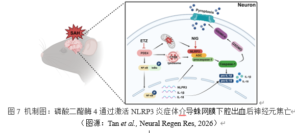 中国重庆医科大学附属第一医院的何朝晖团队在《中国神经再生研究(英文)》(Neural Regeneration Research)上发表的研究发现,磷酸二酯酶4通过激活NF-κB通路,并同时引起溶酶体和线粒体功能障碍,三者共同促进NLRP3的激活诱发神经元焦亡参与蛛网膜下腔出血后早期脑损伤。抑制磷酸二酯酶4可通过减轻神经元焦亡改善早期脑损伤。激动NLRP3可以逆转抑制磷酸二酯酶4产生的神经保护作用。研究为蛛网膜下腔出血的治疗提供新的潜在靶点磷酸二酯酶4。谭嘉禾和马寅瑞为论文共同第一作者,何朝晖教授为论文通讯作者。