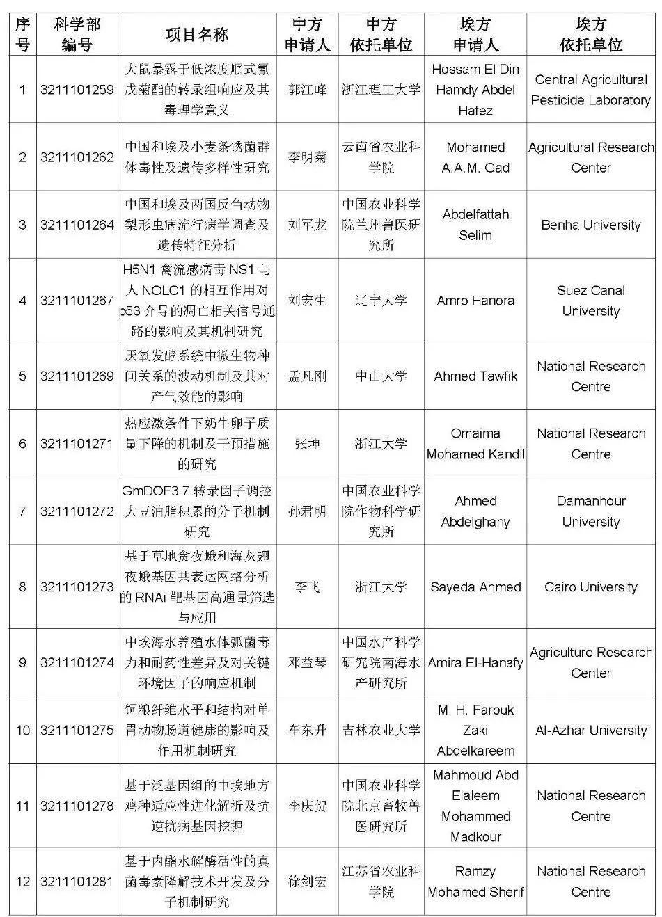 根据国家自然科学基金委员会(NSFC)与埃及科学研究技术院(ASRT)签署的合作协议和之后达成的合作共识,2021年双方将共同资助合作研究项目,支持两国科学家开展实质性的创新研究与合作。经过公开征集,共收到项目申请41项。经初步审查并与埃方核对清单,共受理项目申请36项。现将通过初审的项目申请公布如下: