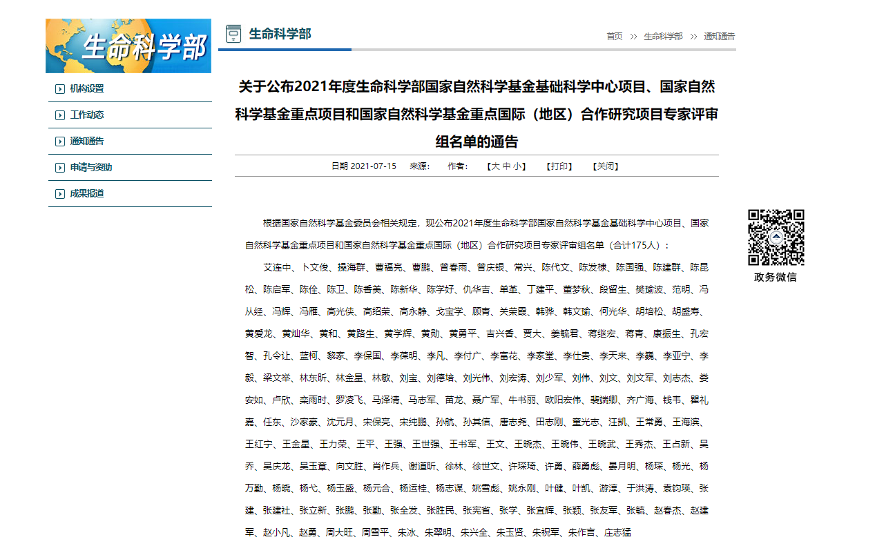 关于公布2021年度生命科学部国家自然科学基金基础科学中心项目、国家自然科学基金重点项目和国家自然科学基金重点国际(地区)合作研究项目专家评审组名单的通告