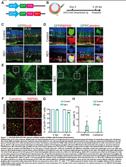 To test whether ND1 can convert retinal Müller glial cells into neurons, we first intravitreally injected AAV7m8 GFAP::GFP-ND1 or a control virus expressing GFP alone (AAV7m8 GFAP::GFP) into the eyes of the mice (Figure 1A). At 5- or 28-days post-injection (dpi), we stained the retinas for glial and neuronal markers (Figure 1B, experimental protocol illustrated). At 5 dpi, for both control and ND1 groups, essentially all GFP+ cells expressed glial cell marker Sox9 in the Müller cell layer (Figure 1C, left column), confirming the specific infection of Müller glial cells by our AAV. At 28 dpi, all GFP+ cells in the control group still had the typical morphology of Müller cells, with long processes expanding through the whole retina, and cell somas expressing Sox9 (Figure 1C, top right panel). In contrast, although the majority of GFP+ cells in the ND1 group were still Sox9+ (i.e., Müller glia) at 28 dpi, a small percentage of them were not and were located away from the Müller glia layer (Figure 1C, bottom right panel, white arrows). Because all GFP+ cells were initially Sox9+ Müller glia, the fact that some cells stopped expressing Sox9 suggested that they might start to change their identity. To determine whether these observed changes were due to a change in cell type from glia to neuron, we performed immunostaining for markers of inner retinal neurons. In ND1 group at 28 dpi, we identified a few GFP+ cells in the GCL expressing ganglion cell marker RBPMS (Figure 1D, D1 to D4 showing an enlarged cell in ND1 group). We also identified GFP+ cells in the INL expressing amacrine cell marker Calretinin (Figure 1D, D’1 to D’4 showing an enlarged cell in ND1 group).