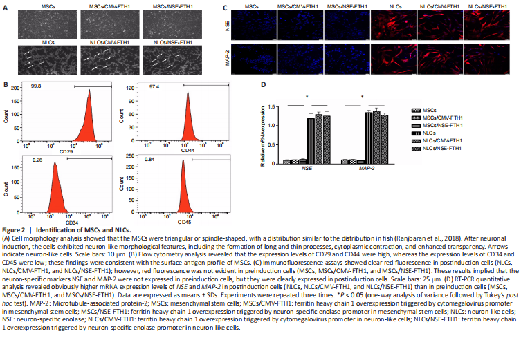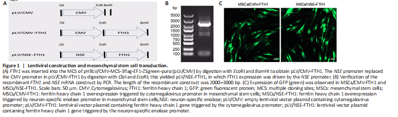 To ensure FTH1 was expressed only when MSCs differentiated into NLCs, FTH1 expression was controlled by the NSE promoter. PCR confirmed that the length of the recombinant FTH1 and NSE mRNA construct was between 2000 and 3000 bp (Figure 1B), which was consistent with the sum of their individual lengths. Furthermore, gene sequencing confirmed that the sequences of the FTH1 gene and NSE promoter were correct (Additional file 1). Green fluorescence was observed after transduction in 293T cells, indicating successful virus packaging. Assessments of fluorescence intensity and cell state (Figure 1C) after transduction revealed that the best MOIs of CMV-FTH1 and NSE-FTH1 for MSCs were 15 and 10, respectively. MSCs/CMV-FTH1 and MSCs/NSE-FTH1 were constructed by transducing the recombinant lentivirus CMV-FTH1 or NSE-FTH1 into MSCs at the selected MOIs.