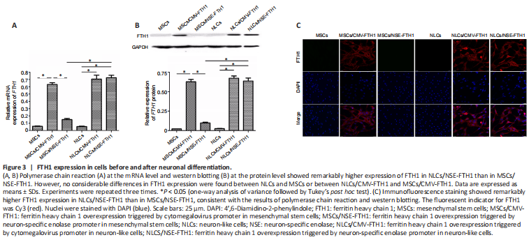 The mRNA or protein expression of FTH1 in each group of cells was determined by PCR, western blotting, or immunofluorescence staining. PCR revealed remarkably greater mRNA expression of FTH1 in NLCs/NSE-FTH1 than in MSCs/NSE-FTH1. No considerable differences were found in the mRNA expression of FTH1 between MSCs and NLCs or between MSCs/CMV-FTH1 and NLCs/CMV-FTH1 (Figure 3A). The results of western blotting and immunofluorescence staining were consistent with the results of PCR (Figure 3B and C). The above findings suggested that the NSE promoter specifically induced reporter gene expression after neuronal differentiation, whereas the CMV promoter induced constitutive reporter gene expression (i.e., regardless of neuronal differentiation).