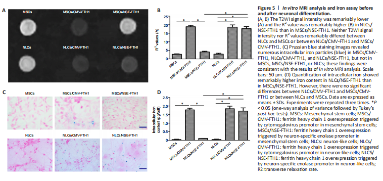 The FTH1-induced accumulation of intracellular iron was qualitatively analyzed via Prussian blue staining and quantitively assayed via cellular iron measurements. Prussian blue staining revealed greater accumulation of intracellular iron particles in MSCs/CMV-FTH1, NLCs/CMV-FTH1, and NLCs/NSE-FTH1, compared with MSCs, MSCs/NSE-FTH1, and NLCs, respectively (Figure 5C). These results were consistent with the in vitro MRI findings, indicating that the NSE promoter was activated by neuronal differentiation and therefore induced FTH1 expression, which led to accumulation of intracellular iron. Quantitative analysis revealed remarkably higher intracellular iron content in postinduction cells (NLCs/NSE-FTH1) than in preinduction cells (MSCs/NSE-FTH1). No significant differences were observed between MSCs and NLCs or between MSCs/CMV-FTH1 and NLCs/CMV-FTH1 (Figure 5D).
