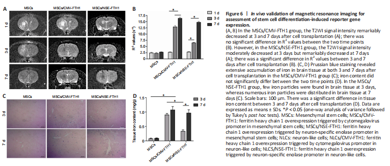 Prussian blue staining revealed numerous iron particles distributed in brain tissue at both 3 and 7 days after cell transplantation in the MSCs/CMV-FTH1 group (Figure 6C). Iron content did not significantly differ between the two time points (Figure 6D), which was consistent with the findings of rat MRI examinations. In the MSCs/NSE-FTH1 group, few iron particles were observed at 3 days, whereas numerous iron particles were detected at 7 days (Figure 6C). The tissue iron content was remarkably different between 3 and 7 days after cell transplantation (Figure 6D). These results showed that NSE promoter-driven FTH1 expression was dependent on neuronal differentiation, whereas CMV-driven reporter gene expression could not indicate whether cells had undergone differentiation.