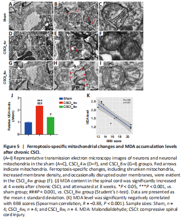 Figure 5| Ferroptosis-specific mitochondrial changes and MDA accumulation levels after chronic CSCI.