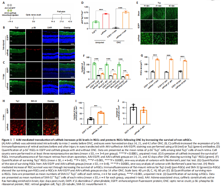 Figure 1|AAV-mediated transduction of caRheb increases p-S6 levels in RGCs and protects RGCs following ONC by increasing the survival of non-αRGCs.