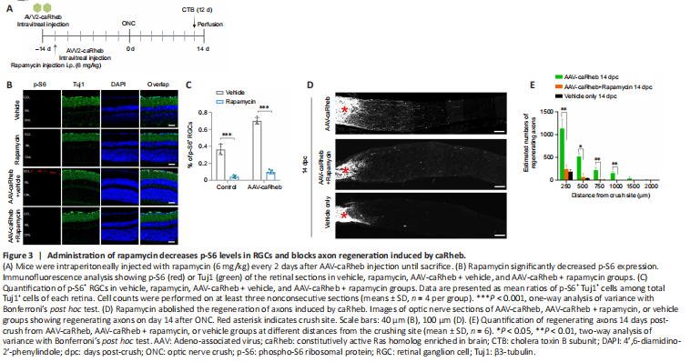 Figure 3|Administration of rapamycin decreases p-S6 levels in RGCs and blocks axon regeneration induced by caRheb.