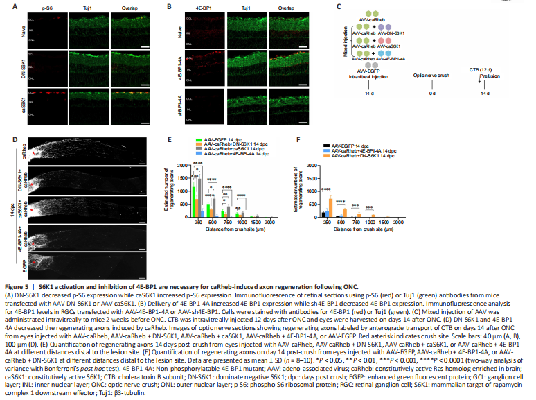 Figure 5|S6K1 activation and inhibition of 4E-BP1 are necessary for caRheb-induced axon regeneration following ONC.