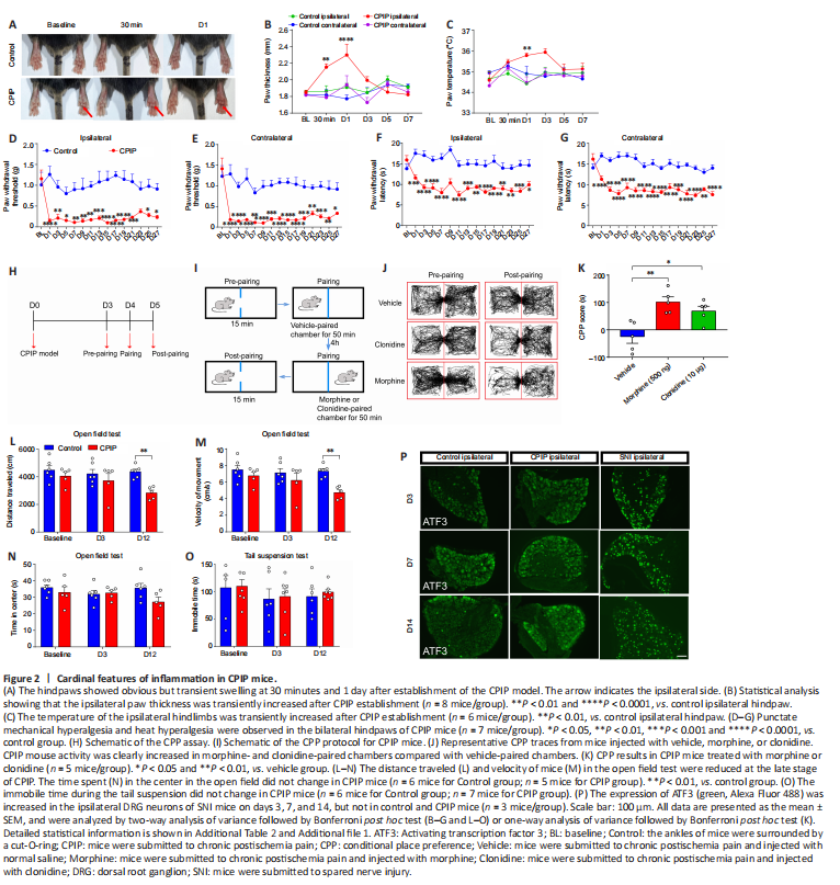 We first established the CPIP mouse model by inducing prolonged hindpaw ischemia-reperfusion to mimic clinical CRPS-1 (Chen et al., 2020a; De Logu et al., 2020). The CPIP mice exhibited cardinal features of inflammation, including redness, swelling, heat, and nociceptive behavior. The ipsilateral hindpaws of CPIP mice showed transient but obvious redness, edema, and an increased temperature 30 minutes after reperfusion, and these effects lasted for 1 day (Figure 2A–C). Furthermore, the CPIP mice showed clear, persistent heat hyperalgesia and punctate mechanical hyperalgesia in the bilateral hindpaws that was maintained throughout the 4-week experimental period (Figure 2D–G). We also performed a CPP assay, which is widely used to measure ongoing or spontaneous pain (Tajerian et al., 2015; Donnelly et al., 2021), to detect nonreflexive nociception in the CPIP mice. A single injection of morphine or clonidine induced obvious CPP in the CPIP mice (Figure 2H–K), suggesting the existence of both reflexive and nonreflexive pain in CPIP mice.