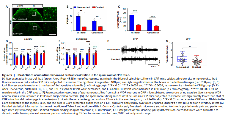 Next, we asked whether HIS attenuated CPIP-induced neuroinflammation and central sensitization. To assess this, we examined spinal Iba1 immunofluorescence staining in CPIP mice that engaged in HIS or no exercise. Iba1 fluorescence intensity and the number of Iba1-positive cells were reduced in the HIS group compared with the no exercise group (Figure 5A–C). In addition, TNF-α, IL-1β, and IL-6 levels were lower, and IL-4 and IL-10 levels were higher, in the bilateral spinal cord in the HIS CPIP group compared with the no exercise CPIP group (Figure 5D and E). We also observed lower spontaneous firing of WDR neurons in the HIS CPIP group compared with the no exercise CPIP group (Figure 5F and G). Based on these results, HIS exercise attenuates nociception by ameliorating neuroinflammation and decreasing the hyperactivity of spinal dorsal horn neurons.