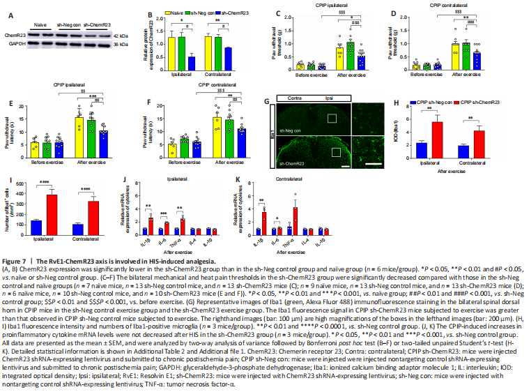 To explore the role of the RvE1-ChemR23 axis in HIS-induced analgesia, we next injected mice with an RNA interference virus to knock down ChemR23 expression in the spinal cord. As expected, ChemR23 protein expression was lower in the sh-ChemR23 group than in the control virus group, verifying that ChemR23 was downregulated in the spinal cord (Figure 7A and B). After successfully knocking down ChemR23 expression in the spinal cord, we found that the analgesic effect of HIS was substantially inhibited in the sh-ChemR23 group compared with the na?ve and sh-Neg control groups (Figure 7C–F). In addition, the HIS-induced inhibition of microglial activation in CPIP mice and the decreased levels of IL-1β, IL-6, and TNF-α in the HIS CPIP group were all blocked in the sh-ChemR23 group compared with the sh-Neg control group (Figure 7G–K). Thus, the RvE1-ChemR23 axis may mediate HIS-induced analgesia and inhibit neuroinflammation in CPIP mice.