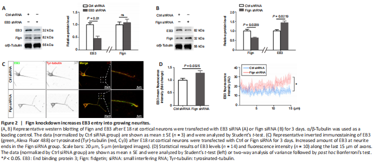 Next, we investigated whether Fign depletion affects EB3 expression or localization. First, we confirmed the knockdown efficiency of Fign-siRNA (Additional Figure 1A and B). We then confirmed that Fign siRNA-treated neurons displayed notably longer axons and more branches than neurons under the control (Ctrl) siRNA treatment (Additional Figure 1C and D). This phenomenon is consistent with our observation of an increase in NF200 following Fign depletion after SCI. To further examine the relationship between Fign and EB3 expression, we depleted EB3 or Fign using RNA interference and examined changes in their expression. Our results showed that depletion of EB3 did not change expression of Fign (Figure 2A). Conversely, depletion of Fign significantly increased expression of EB3 (Figure 2B). Depletion of Fign increased the amount of EB3 at the end of neurites (Figure 2C). We further analyzed the fluorescence intensity and distribution of EB3 at the distal (15 μm) neurite ends. These results showed that EB3 increased significantly at the distal end of growing neurites after Fign depletion (Figure 2D). This suggests that depletion of Fign results in augmentation of the Tyr-tubulin mass by promoting EB3 entry into growing neurites.