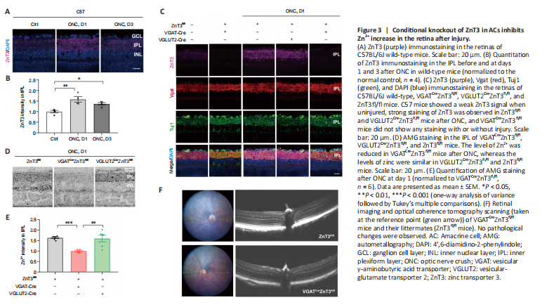 Figure 3|Conditional knockout of ZnT3 in ACs inhibits Zn2+ increase in the retina after injury.