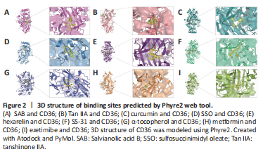 结果:SAB has been previously reported to target CD36, and surface plasmon resonance analysis showed that SAB directly bound to CD36. For this review, we performed molecular docking prediction for SAB and CD36 using Autodock Vina software (http://vina.scripps.edu; Eberhardt et al., 2021), and the results showed that SAB does have a binding spatial structure with CD36, which further explained the basis of its function (Figure 2A). One study found that SAB not only reduced oxLDL-induced CD36 expression in in vitro experiments but also inhibited CD36 in in vivo experiments (Bao et al., 2012a). Further experimental studies were conducted to determine whether SAB could inhibit CD36 in lipid metabolism-related neurological disorders and thus provide therapeutic benefits. Hyperlipidemia can exacerbate post-stroke injury with severe brain swelling, and researchers further investigated the role of CD36 inhibition in reducing infarct size and swelling in patients with hyperlipidemic stroke (Kim et al., 2020). Unfortunately, the mechanisms of action were not clarified in this study. However, it has been shown that SAB can improve metabolic function by inhibiting CD36 expression, thereby reducing visceral fat accumulation and improving insulin resistance in a wild-type mouse model of obesity (Yang et al., 2018). Thus, inhibition of CD36 by SAB may normalize metabolic function in patients with hyperlipidemia and reduce brain swelling after stroke. Furthermore, the loss of vascular tonus and BBB integrity underpins the pathology of stroke and AD, and stroke pathology also involves multiple factors that contribute to the death response, including inflammation and oxidative stress. CD36 has been used as a therapeutic target for endothelial dysfunction in stroke, where CD36-mediated pathways are activated by different ligands that will lead to inflammatory responses and endothelial dysfunction (Richards et al., 1994; Cho, 2012). SAB, as a CD36 antagonist, has been shown to inhibit the production of mitochondrial reactive oxygen species in endothelial cells and reduce oxLDL to achieve a protective effect in endothelial cell dysfunction (Ko et al., 2020). Therefore, the use of SAB to improve endothelial dysfunction and the inflammatory response is beneficial for alleviating stroke progression, but more experiments are needed to elucidate the exact mechanisms behind the inhibition of CD36 by SAB in neurological diseases. Notably, in neurological diseases not associated with lipid metabolism such as SCI, targeted inhibition of CD36 expression using SAB has been shown to attenuate CD36-mediated scar formation after SCI to reduce fibrosis, providing theoretical data for the treatment of spinal scars (Gong et al., 2023). In conclusion, SAB as an effective CD36 antagonist has potential for the treatment of neurodegenerative diseases and related complications by inhibiting CD36 function.