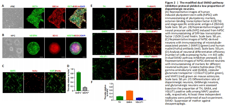 As shown, hiPSC expressed OCT4 and SSEA4 before differentiation, reflecting the stem cell characteristics and multi-differentiation potential of the hiPSC in our study (Figure 2A). The morphology of hiPSC changed during culture from day 0 to day 8 with dual inhibitor. On day 20, both SOX2 and Nestin were highly expressed, indicating that cells at this stage showed NPC characteristics (Figure 2B). Overall, 84% of cells successfully differentiated into neurons, based on MAP2 immunofluorescence staining (Figure 2C and D). On day 33, we observed the expression of multiple subtypes of neuronal markers such as dopaminergic neurons (Figure 2D). The results showed that different subtypes of neurons including 13% glutaminergic neurons, 21% dopaminergic neurons, and 56% GABAergic neurons (Figure 2E and F). However, few cells expressed mDA biomarkers.