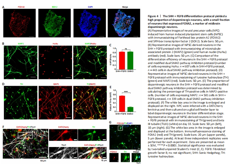 Figure 4| The SHH + FGF8 differentiation protocol yielded a high proportion of dopaminergic neurons, with a small fraction of neurons that expressed FOXA2, a marker of midbrain dopaminergic neurons.