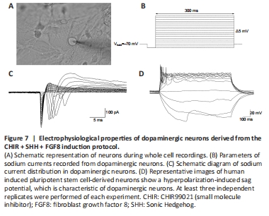 We then performed electrophysiological tests (Figure 7A) on the neurons induced by our neural induction protocol. The results showed that the neurons exhibited sodium currents when the voltage was held at –70 mV (Figure 7B and C), and a hyperpolarization-induced “sag” potential characteristic when action potentials were evoked (Figure 7D); this is consistent with characteristics of dopaminergic neuronal subtypes (Yang et al., 2001; Niclis et al., 2017; Zou et al., 2018). Therefore, our evidence suggests that the application of SHH, FGF8, and Purmorphamine combined with CHIR99021 during neural induction improved the efficiency of mDA neuronal differentiation. This offers the possibility of generating a large number of mDA neurons for translational medicine research.