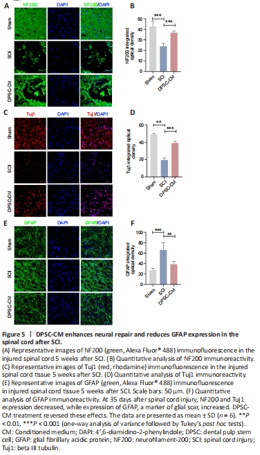 Figure 5|DPSC-CM enhances neural repair and reduces GFAP expression in the spinal cord after SCI.