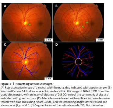 Standardized digital fundus photographs were taken within 72 hours of hospital admission by dilating the patient’s pupil with 1% tropicamide eye drops (Xingqi Eye Medicine, Inc., Shenyang, China). To ensure consistency, all images were captured using the same camera model (Topcon TRC-50DX, Topcon, Inc., Tokyo, Japan) and centered on the optic disc, with a 50° range. Both the left and the right eyes were photographed, and the parameters were averaged and analyzed for each patient. The retinal vascular parameters were graded at the Guangdong-Hongkong-Macau Institute of Central Nervous System (CNS) Regeneration (GHMICR) of Jinan University using Canvus 14 (Advanced Cell Diagnostics, Inc., Newark, CA, USA) and NeuroLucida (MBF Biosciences Inc., Boston, MA, USA) software. This quantitative method was based on our previous study (Zhao et al., 2020; Figure 1), which also provides detailed information on the definition and automatic calculation of these parameters.