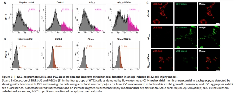 Figure 3|NSC-ex promote SIRT1 and PGC1α secretion and improve mitochondrial function in an Aβ-induced HT22 cell injury model.