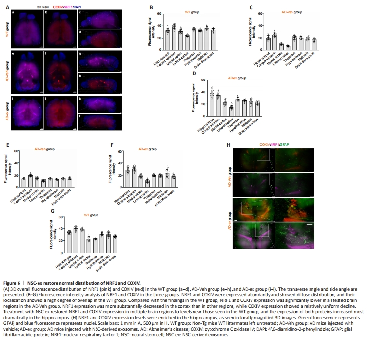 NRF1 and COXIV fluorescence signals were detected simultaneously in mouse brains. Combining 3D views and fluorescence signal intensity analysis showed that NRF1 and COXIV were abundantly expressed in WT mice, and their spatial distributions overlapped substantially (Figure 6Aa–d, B, and G). Compared with those in the WT group, NRF1 and COXIV expression levels were significantly lower in all tested brain regions in the AD-Veh group. However, NRF1 expression was decreased to a greater extent in the cortex than other regions, while COXIV expression showed a relatively homogenous decline (Figure 6Ae–h, C, and E). Treatment with NSC-ex restored NRF1 and COXIV expression in multiple brain regions to levels close to those seen in WT brains, with the most striking enrichment seen in the hippocampus (Figure 6Ai–l, D, F, and H), indicating that significant protein synthesis occurs in this region. These observations are consistent with our WB results (Figure 4C), which showed that NRF1 expression recovered more fully than COXIV expression in the hippocampus. Moreover, significant fluorescence hyperintensities were observed in the lateral ventricles of AD-Veh and AD-ex groups (Figure 6Ae–l, H), which could be attributable to the accumulation of specific antibodies in these local cavities. Hence, NSC-ex rescue the AD-induced reduction in NRF1 and COXIV expression to varying degrees, restore their normal distribution patterns, and most noticeably affect the hippocampus.