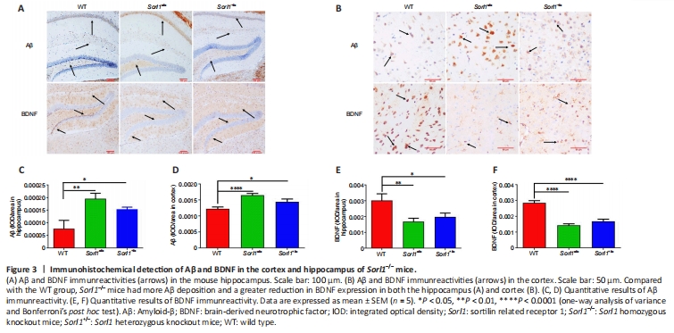 Figure 3|Immunohistochemical detection of Aβ and BDNF in the cortex and hippocampus of Sorl1–/– mice.