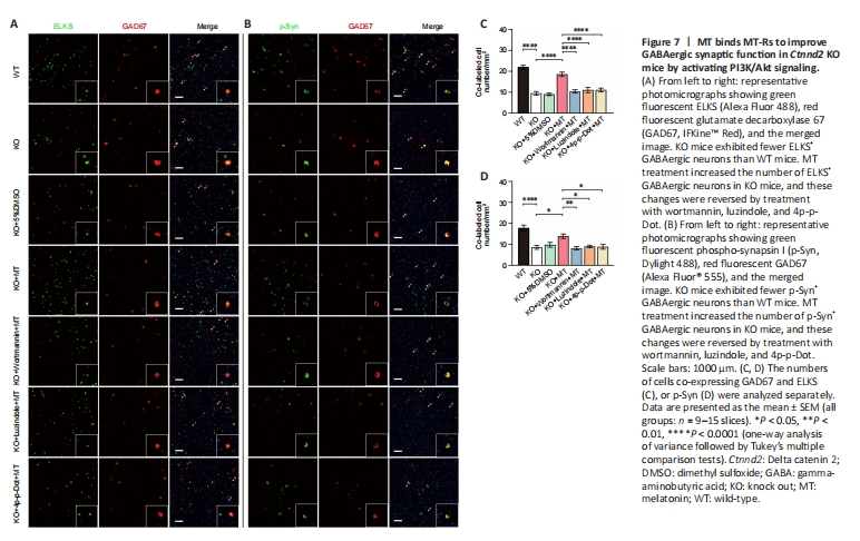 To investigate the effect of MT on GABAergic neurons in the PFC, we used immunofluorescence staining to examine MT1R, MT2R, and GAD67 co-expression. Our analysis indicated that GABAergic (GAD67-positive) neurons expressed both MT1Rs and MT2Rs (Figure 6A and B). Next, we asked whether MT promotes GABAergic neuron activity. Consistent with the western blot results, KO mice exhibited fewer ELKS+ (P < 0.0001) and p-Syn+ (P < 0.0001) GABAergic neurons than WT mice (Figure 7A–D). Local infusion with MT increased the numbers of ELKS+ and p-Syn+ GABAergic neurons, and these changes were reversed by treatment with wortmannin, luzindole, and 4p-p-Dot (ELKS: P < 0.0001 for KO vs. KO + MT group, P < 0.0001 for KO + wortmannin + MT vs. KO + MT group, P < 0.0001 for KO + luzindole + MT vs. KO + MT group, P < 0.0001 for KO + 4p-p-Dot + MT vs. KO + MT group; p-Syn: P = 0.0112 for KO vs. KO + MT group, P = 0.0032 for KO + wortmannin + MT vs. KO + MT group, P = 0.0319 for KO + luzindole + MT vs. KO + MT group, P = 0.0232 for KO + 4p-p-Dot + MT vs. KO + MT group, Figure 7A–D). Taken together, these results indicate that MT ameliorated GABAergic synaptic function by binding to MT-Rs on GABAergic neurons and activating the PI3K/Akt signaling pathway in Ctnnd2 KO mice.