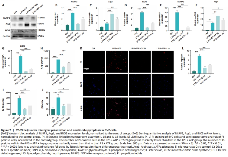 Finally, we confirmed the relationship between NLRP3 and pyroptosis in BV2 cells. The data demonstrated that LDH levels were markedly higher in the LPS + ATP group compared with the LPS+ATP+CY-09 group (Figure 7J). Furthermore, the number of PI-positive cells in the LPS + ATP group was markedly higher than that in the LPS + ATP + CY-09 group (Figure 7K and L). The results demonstrated that inhibiting activation of the NLRP3 inflammasome alters microglial polarization and alleviates pyroptosis in BV2 cells.