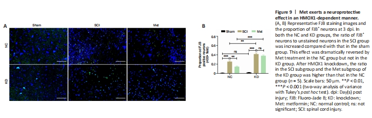Finally, we examined the effect of HMOX1 knockdown on neuronal damage. As depicted in Figure 9, the proportion of FJB-positive neurons increased significantly following SCI in the NC and KD groups. In the NC group, Met treatment noticeably reduced neuronal damage, but this effect was not pronounced in the KD group. In the SCI and Met subgroup, HMOX1 knockdown led to a considerable increase in neuronal damage. These findings indicate that HMOX1 upregulation following SCI helps attenuate nerve damage, and that the effectiveness of Met treatment partly relies on HMOX1 upregulation.