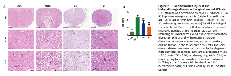 H&E staining was performed to assessed damage at the histopathological levels in the spinal cords of SCI rats. Compared with the sham group, rats in the model group showed degeneration of spinal cord tissue neurons, damage to peripheral neurons, edema, degeneration of the myelin sheath in the white matter, and tissue structure disruption. BA and methylprednisolone improved all of these parameters (Figure 2A) and significantly reduced H&E staining scores in the spinal cord tissue of SCI rats compared with the findings in SCI rats (P < 0.01; Figure 2B). These findings indicate that BA ameliorates damage at the histopathological levels in the spinal rods of SCI rats.