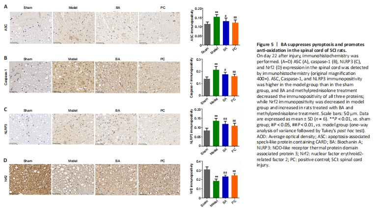We next used immunohistochemistry to observe the expression levels of markers related to the inflammasome (ASC and NLRP3), pyroptosis (caspase-1), and antioxidation (Nrf2) in spinal cord tissue. The results showed that ASC, caspase-1, and NLRP3 immunopositivity was significantly higher, while Nrf2 expression was significantly lower, in the model group than in the sham group (all P < 0.01, Figure 5A–D). Importantly, ASC, caspase-1, and NLRP3 levels were lower in SCI rats than in sham rats, while BA and methylprednisolone treatment increased Nrf2 expression (all P < 0.01, Figure 5A–D). Moreover, qRT-PCR analysis demonstrated that the expression of genes related to the inflammasome (ASC and NLRP3) and pyroptosis (caspase-1 and GSDMD) in spinal cord tissue was higher in SCI rats compared with that in the sham group and decreased in SCI rats treated with BA and methylprednisolone (all P < 0.05, Figure 6A–D). These findings suggest that BA may reduce neuroinflammation and improve antioxidation in the spinal cord of SCI rats. Western blot analysis confirmed that BA or methylprednisolone effectively decreased the expression levels of the inflammasome-related proteins NLRP3, ASC, and GSDMD (all P < 0.05, Figure 6A–H), the expression levels of IL-18, IL-1β, and TLR4, and the ratios of p-P65/P65 and p-IκBα/IκBα in the spinal cord tissue of SCI rats compared with the findings in the model group (all P < 0.05, Figure 6E, I–M). These results show that BA suppresses pyroptosis, which may be related to the decreased inflammasome and increased antioxidation observed in the spinal cord of SCI rats.