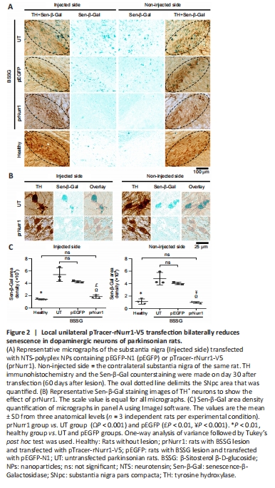 Figure 2|Local unilateral pTracer-rNurr1-V5 transfection bilaterally reduces senescence in dopaminergic neurons of parkinsonian rats.