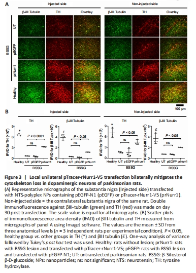 Figure 3|Local unilateral pTracer-rNurr1-V5 transfection bilaterally mitigates the cytoskeleton loss in dopaminergic neurons of parkinsonian rats.