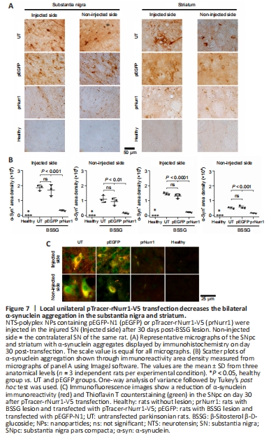 Figure 7| Local unilateral pTracer-rNurr1-V5 transfection decreases the bilateral α-synuclein aggregation in the substantia nigra and striatum.