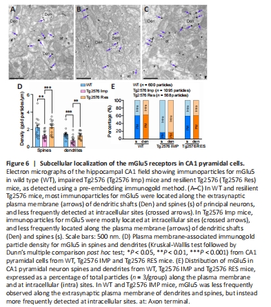 A previous study has revealed a decrease in the density of mGlu5 receptors in dendritic spines and dendritic shafts of CA1 pyramidal cells in APP/PS1 mice (Martín-Belmonte et al., 2021). To expand on this, our next set of analyses aimed to compare the subcellular localization of mGlu5 receptors associated with excitatory synapses in three groups: wild type, impaired Tg2576, and resilient Tg2576 mice. In wild-type mice, mGlu5 immunoparticles were detected to be present in the extrasynaptic plasma membrane of spines and shafts of CA1 pyramidal cells and were also associated with intracellular sites within the same neuronal compartments (Figure 6A). In impaired Tg2576 mice, we observed a significant reduction in the density of mGlu5 immunoparticles in dendritic compartments (P < 0.001 for spines and dendrites, Kruskal-Wallis test) compared with wild-type mice (Figure 6B and D). This decrease in plasma membrane localization was accompanied by an increase in cytoplasmic localization (Figure 6E). Conversely, in resilient Tg2576 mice, the density of mGlu5 immunoparticles was found to be similar to that of wild-type mice (Dunn’s multiple comparison post hoc; Figure 6C and D). Additionally, the percentage of mGlu5 immunoparticles along the plasma membrane and at cytoplasmic sites was also comparable to wild-type mice (Figure 6E). In summary, the amount of mGlu5 receptors in resilient mice was maintained at wild-type levels but was increased compared with cognitive impaired mice.